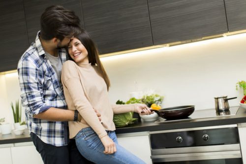 Couple cooking under the light of the cabinet lights